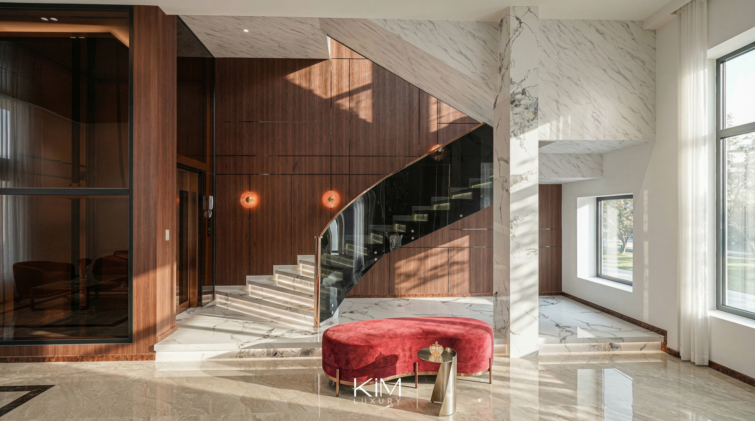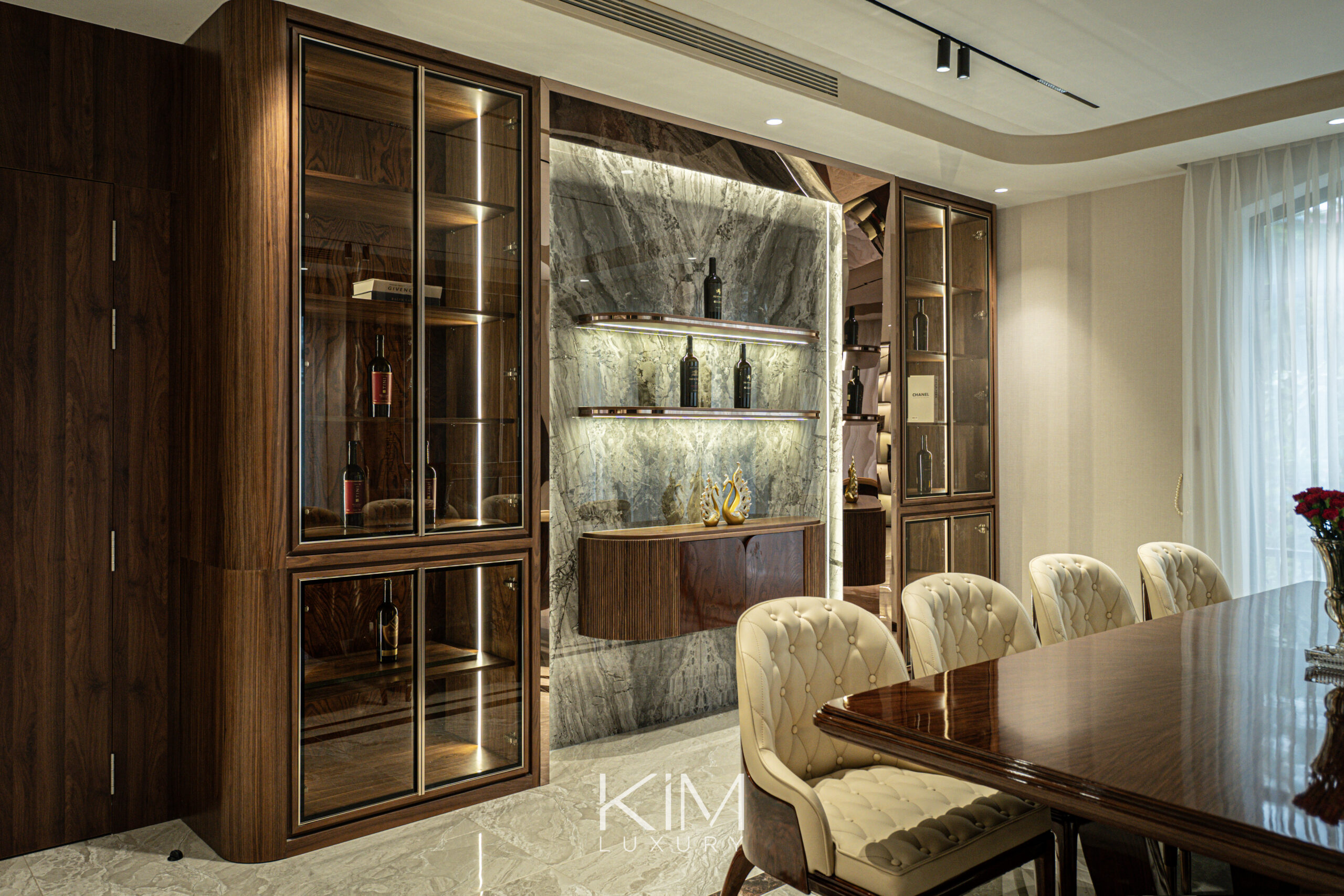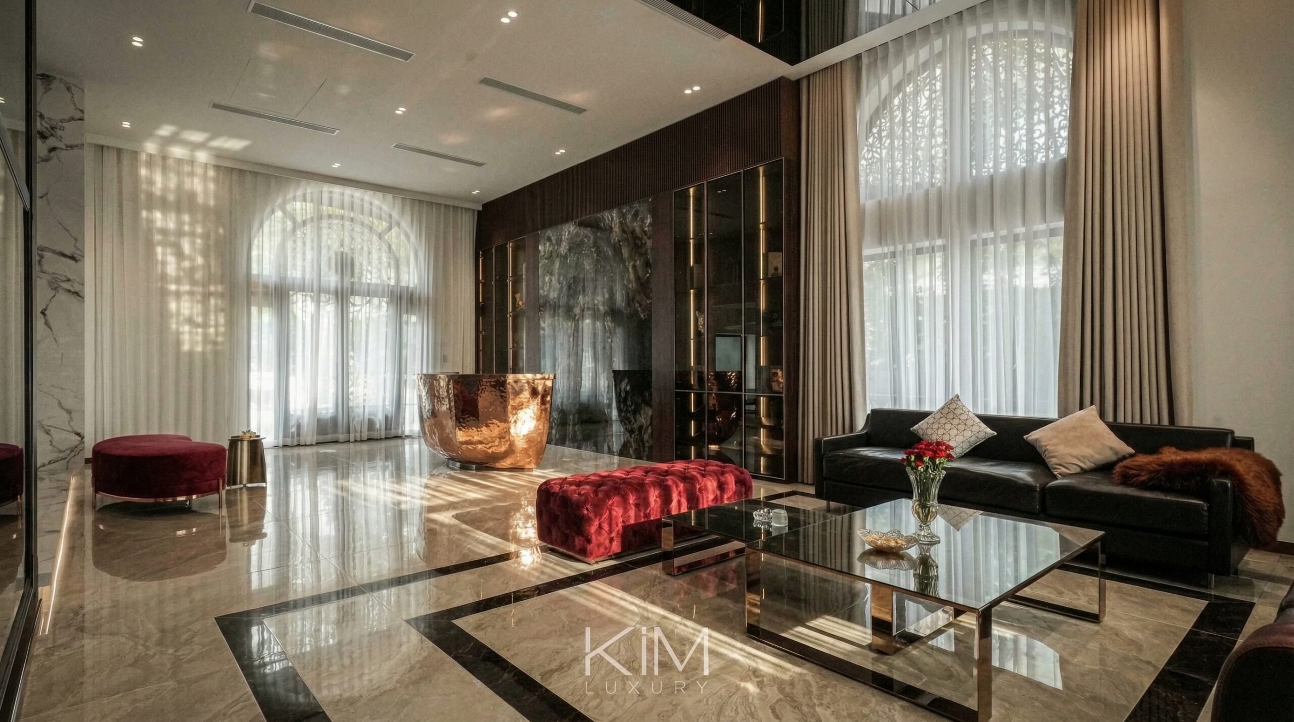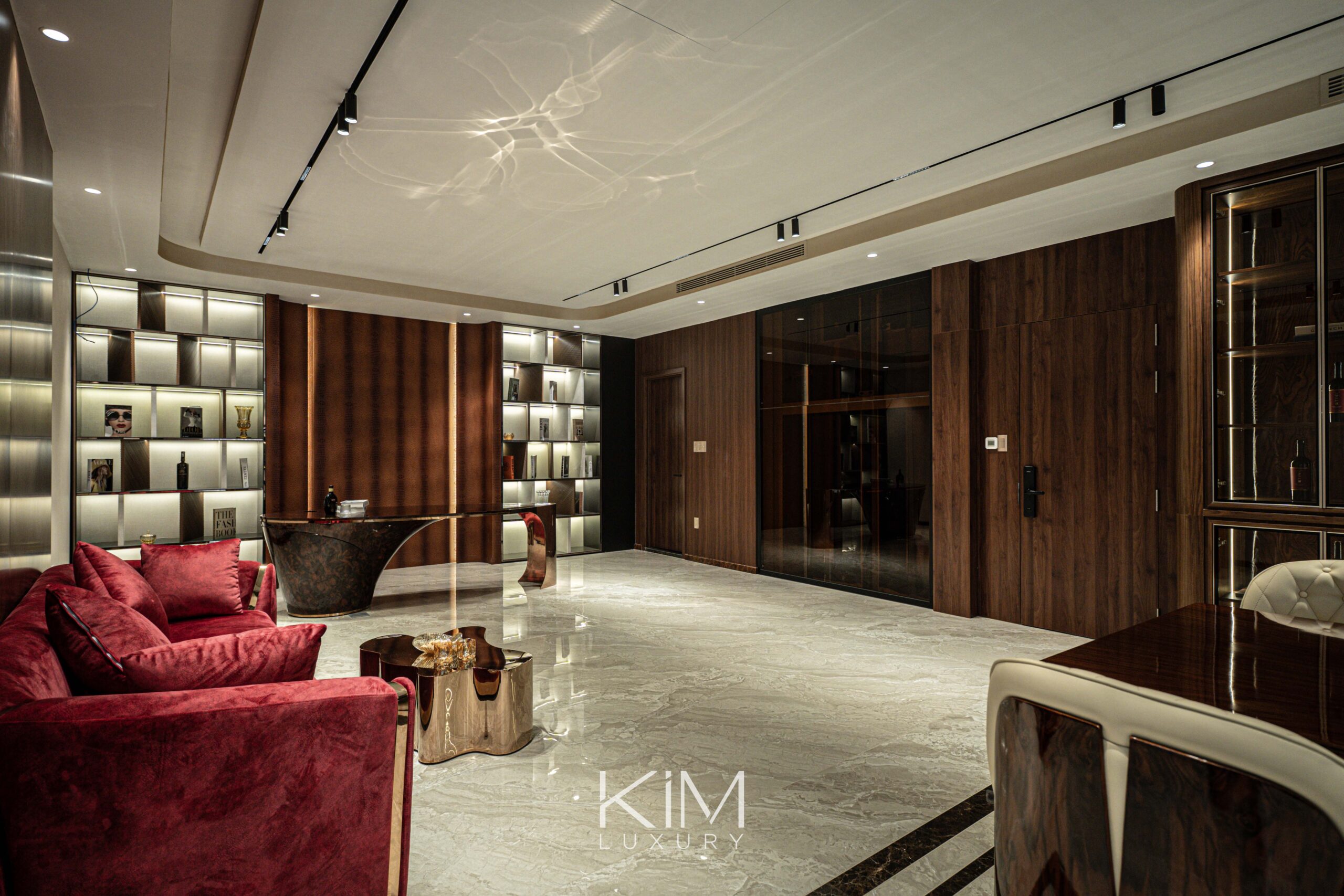 Kim Luxury đặc biệt chú trọng vào việc khai thác nguồn sáng tự nhiên qua hệ cửa kính lớn, kết hợp khéo léo cùng hệ thống ánh sáng gián tiếp. Sự sắp đặt này giúp duy trì trạng thái thị giác êm dịu, mềm mại, mang lại cảm giác thư thái tuyệt đối trong mọi sinh hoạt thường nhật.