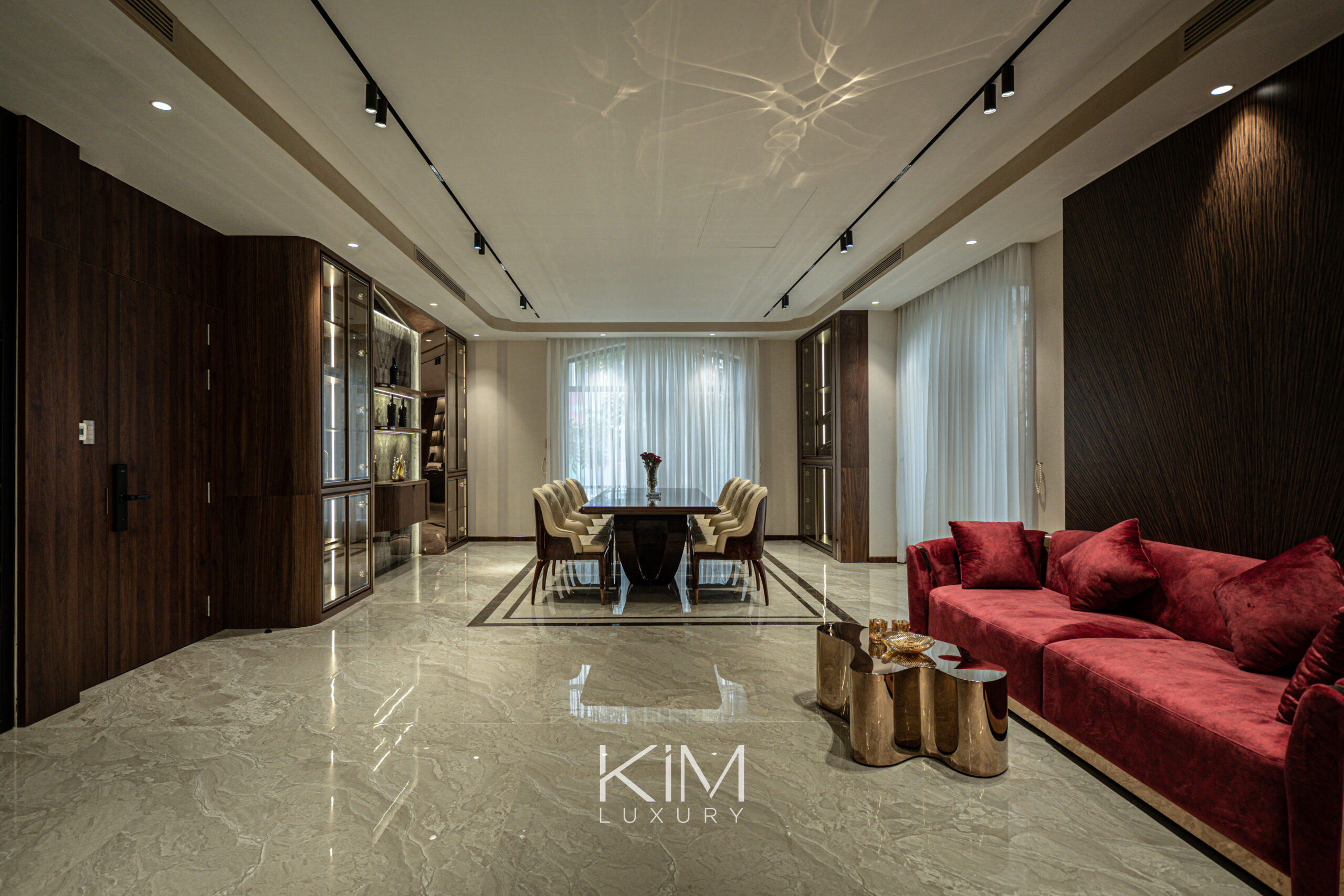 Sự tương phản đầy tinh tế giữa hệ sàn Marble bóng nhẹ và các mảng tường ốp gỗ tông màu trầm tối đã kiến tạo nên một chiều sâu không gian đầy quyền quý, thiết lập sự cân bằng hoàn hảo giữa cảm giác ấm áp và diện mạo đẳng cấp. Những điểm nhấn đầy tính nghệ thuật như bộ Sofa sắc đỏ rượu vang, bàn đá tự nhiên và các chi tiết kim loại ánh vàng không chỉ khẳng định “gu” thẩm mỹ độc bản của gia chủ mà còn tạo nên sự sang trọng ngầm đầy lôi cuốn, không cần phô trương.